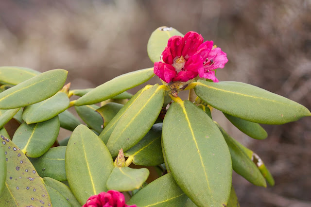 The ridgeline rhododendrons were again different from the previous days; they were more like small shrubs with white or yellow flowers mixed with some larger bright pink types that were just opening.The last part of the trek was 4 hours of steep downhill walking. Ouch, my poor toes. I took a few parting photos of flowers, like this red spurge, or Euphorbiaceae.